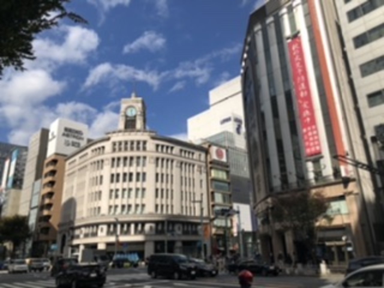 秋の爽やかな晴れの日、交差点の和光のビルが空とコントラストで綺麗です。待ち合わせだけでなく中も見応えあり。- 旅行時期