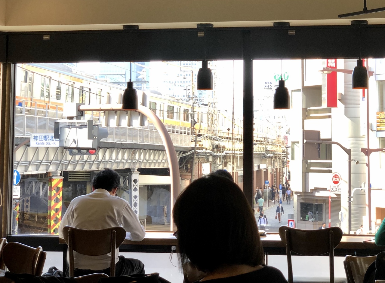 神田駅北口のJRガード沿いにあるスターバックスコーヒーは、二階からの眺めが、線路と同じ目線なので、ぼーっと眺めていても楽しいです。