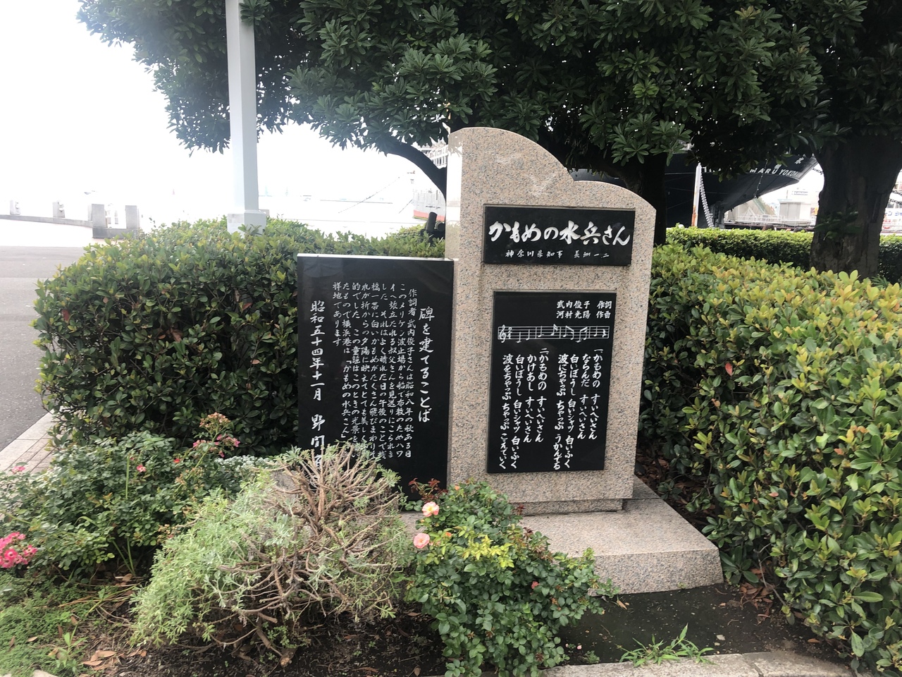 6月の梅雨時ですが、山下公園付近に用事あり、天気が良かったので元町までやってきました。商店街をとおり、山下公園までくるとバラがたくさん咲いているそのそばにこの碑がありました。有名なカモメの水兵さんの歌詞が書いてあり思わず歌ってしまいました。