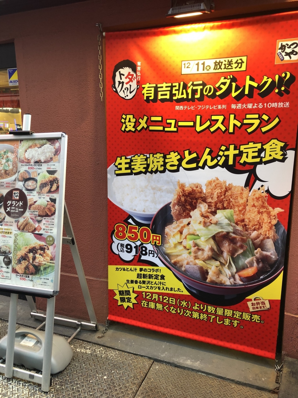 秋葉原駅電気街口から徒歩5分くらいにある格安トンカツのチェーン店です。12月12日からはテレビ番組の企画、没メニューレストラン「生姜焼きとん汁定食」918円税込というのが数量限定あり面白いです。