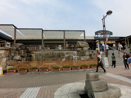 平面的なレイアウトが多い中で壁面を流れる滝にほっと一息。ただ車椅子で階段上のトイレに行こうとなるとまわり道をしなくてはいけません。