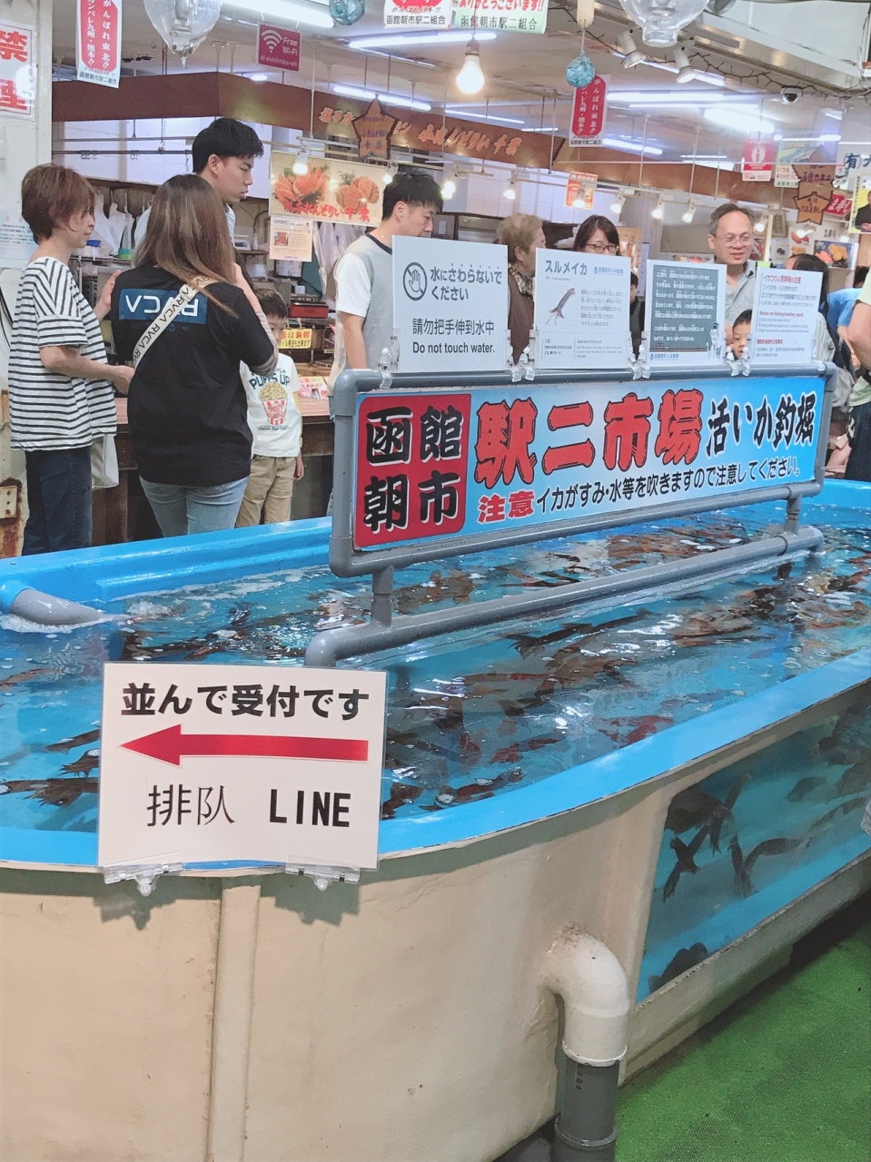 日曜日に行ったので30分程並んでのイカ釣り体験でした。