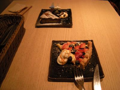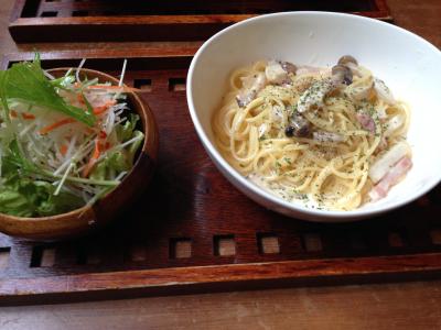 サラダには赤カブ、人参、葉野菜、さつまいも等が入っていてフレンチ風味?だと思います。パスタは太めのパスタでモチモチしてて、レンコンがサクサクしてて美味しかったです!お茶のガトーショコラはどちらかといえば、お茶の風味が強かったですがほろ苦くて美味しかったです。デザートはメニューだけでなくショーケースにある物も注文できるようでした。