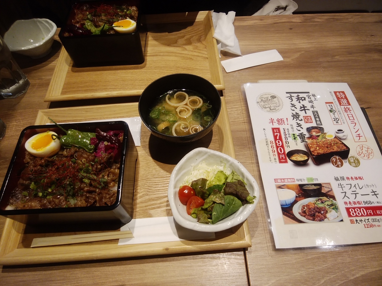 大阪駅でランチを探して見つけました。大阪駅は以前に比べて飲食店も増えて便利になりました。ルクアの地下にも多くの店舗があり和洋中の多くの味が楽しめます。今回はコロナ禍の特別価格のお店を見つけてチャレンジ。通常の半額で美味しい和牛スキ焼き重を味わうことができました。