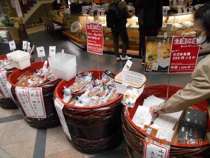 近鉄奈良駅前にある観光客に便利な場所にあります。雨天でもアーケードなので傘をさす手間もなく買い物が楽しめます。奈良漬けの種類も多く、お値段もお手頃価格からあるのでバラマキ土産としても重宝します。店内も広くて開放的なので楽しんで選べます。