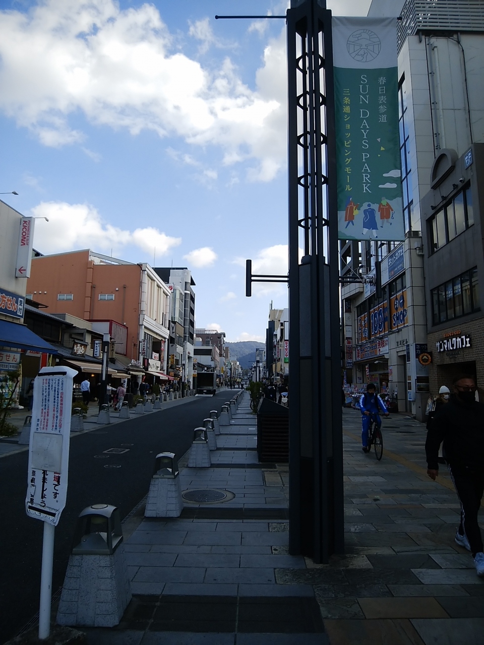 JR奈良駅から近鉄奈良駅、そして猿沢の池・東大寺へと続く観光ロードです。広い歩道に整備されてゆったりと歩けます。お土産物屋さんや飲食店が数多くならび銀行などもあるので便利な通りです。でも今はコロナ禍で観光客は激減してました。