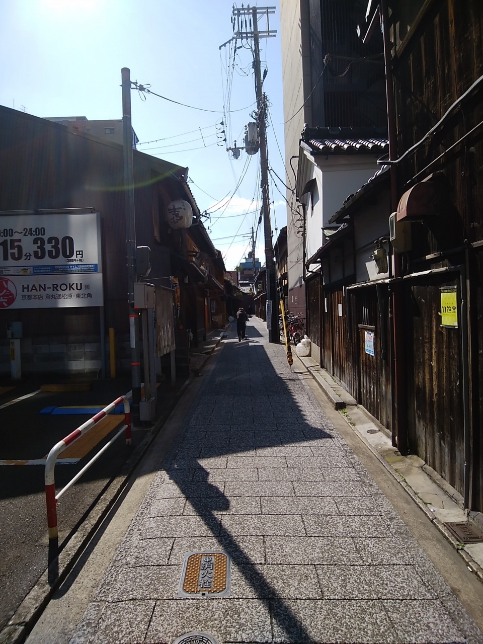 京都に来たら必ず来たの天満宮を参拝するのが慣例です。その北野天満宮は正面の鳥居から参道を通っていくのが通常のコースですが、たまに気分を変えて上七軒の通りから東側の山門を目指して散策します。昼間しか歩くことはないので風情を感じることはありません。