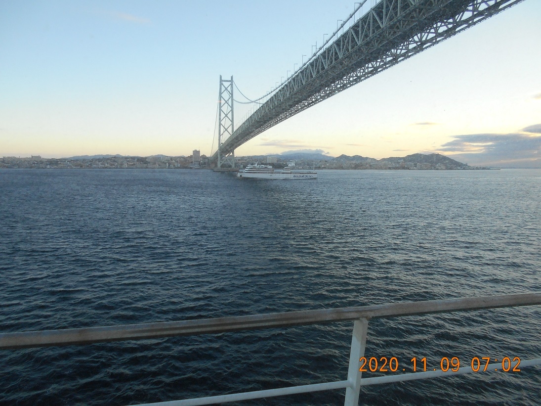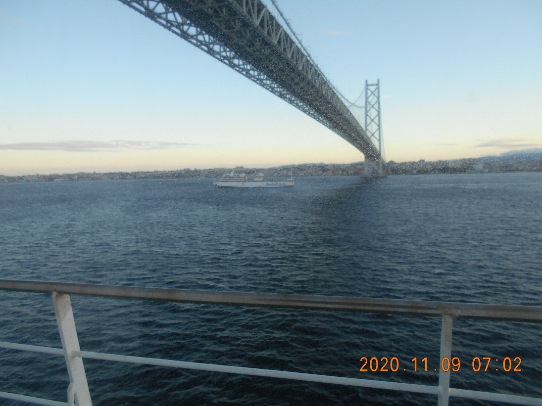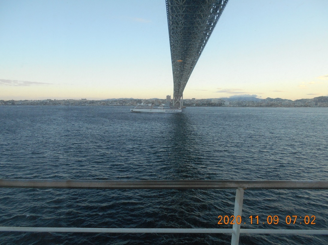 福岡(新門司港)から大阪(南港)へ向かうから早朝に見ることができました。当然のことながら船上ですので真下からみることができ感動ものでした。大きさといい長さといい高さといい人智の産物でこんな素晴らしい大橋を建設できる日本の技術を目のあたりにした思いです。