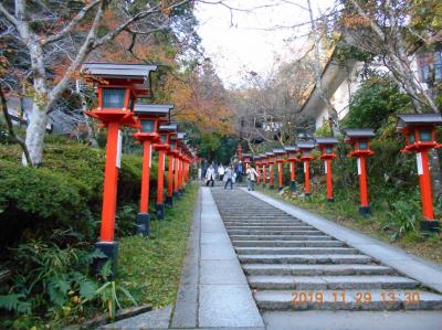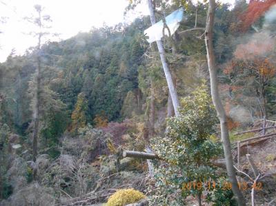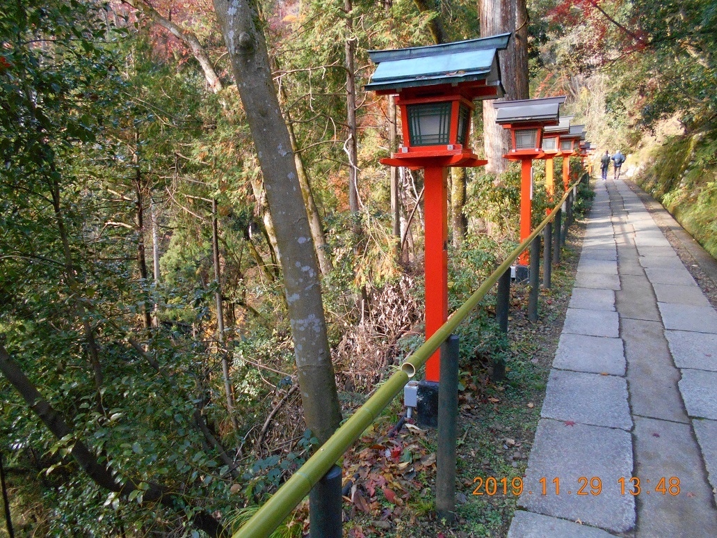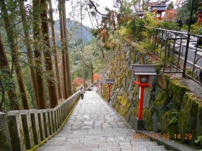 鞍馬寺駅を降りて参道へ。そこからケーブルカーへ乗るか、参道すべてを徒歩でいくかの選択を迫られます。当然のことながら高齢者や登山装備をしていない方はケーブルカーを選ぶべきです。山門からは急な石段と、その先には木々に囲まれた急坂が続きます。鞍馬といえば源義経が修行した所。十分にハードな修行を味わうことができると思います。若い方は是非とも徒歩で上りましょう!! 私は高齢者だったのでケーブルカーを利用しましたけどね。眼下の登山・参道は台風で倒れた木々が散乱していました。