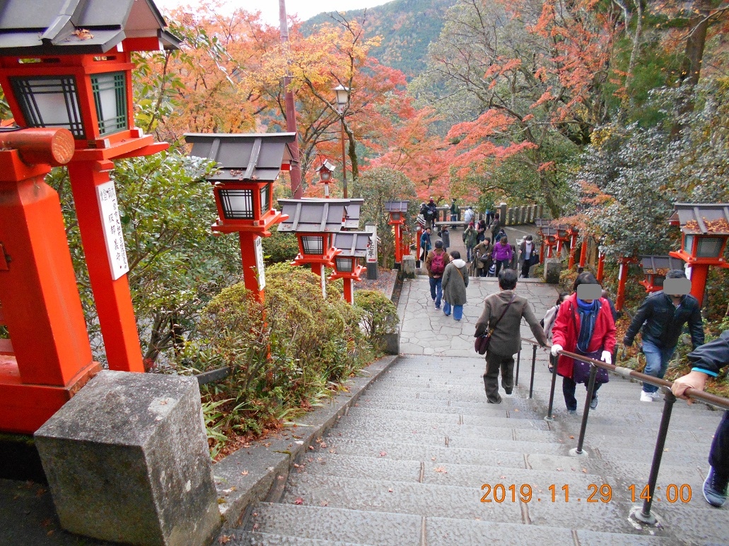 鞍馬寺の本殿は標高410mだそうです。初心者向きの登山コースにある山の高さですね。ちなみに比叡山の標高は848mでした。ケーブルカーを使って、長い石段を昇り、やっとたどり着きました。本堂に入り参拝したのですが撮影禁止だったので内部の様子はよく思い出せません。本堂までの道のりがきつかったので印象に残るのは「大変だった」ということです。でもパワースポットとして有名なのは理解できます。山頂からの景色は必見です。街からずいぶん離れてアクセスが悪いのに、こんな大きな本堂を建設したことに感心します。