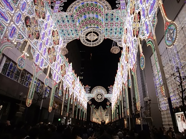 感動的なスケールと鮮やかな世界観にびっくりしました。思った以上のスケールのイルミネーションが続きます。そしてそれ以上に多くの見物客が訪れていることに二度びっくり。これが阪神淡路大地震の追悼としてスタートしたことも多くの共感を感じているのでしょう。光は教会のステンドグラスで色鮮やか。緻密に描かれた幾何学模様を基調とした