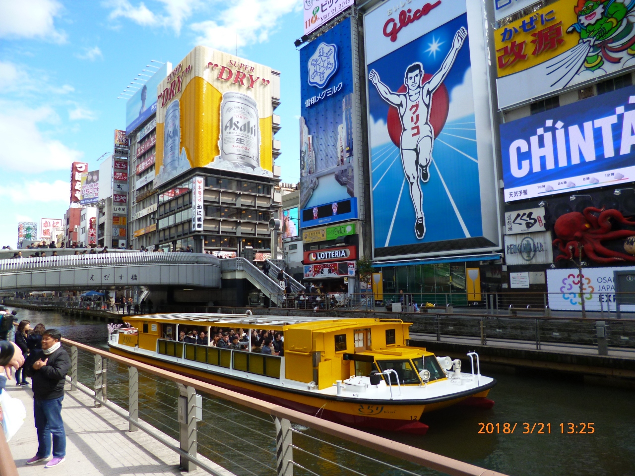 大阪に来たら必ず立ち寄るスポットです。ここに来たら大阪に来たと感じる場所です。グリコの看板を見ると何故かホッとします。あるべきしてあるという安心感ですね。今回は天気も良く、道頓堀を周回する遊覧船に出会いました。