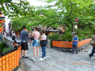 四条川原町から祇園石段下まで続く観光客でいっぱいの大通りから少し上に入ると京都らしさが味わえる通りに出ます。途中に酒場飲食街が二筋ほどあるので意外と見落とすと思います。特に日没後は、大通りからは飲み屋街を抜けて行かなくては行けないので行き難い気がします。でも客引きがあるわけでもないので気にせず行って見ましょう。