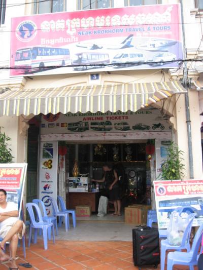 オールドマーケットの北東の日用雑貨店の向かい側のバーストリートにあたるところの、旅行会社から出ているシュムリアップ⇒バンコクのバスはお薦めです。