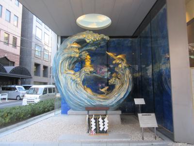 神田明神・随神門を通っていったところに、えびす様のご尊像がありました。デザイン、素晴らしいです。、イルカやタイなど海の仲間に守られて大海原を渡るえびす様の姿が造形されていました。美しくて珍しい像、一見の価値があります。