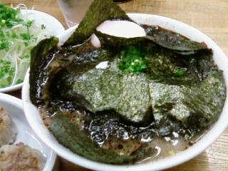 コテコテでボリュームたっぷりで、おいしかったぁ!! 食べたのは、ねぎチャーシュー・半玉子・のり(つまり全部入り!!)+餃子。写真の通り、上面は、トッピングののりやらチャーシューやらで覆い尽くされてて、麺が見えないほどのボリューム!!