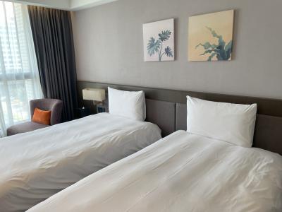 台北は、定宿にしていたシャーウッドホテルがコロナ時に閉鎖、次はどこに泊まろうかと思案した結果、コスパ、雰囲気等の良さそうなサンワンレジデンスを選びましたが、大正解でした。今後も台北ではこのホテルがナンバーワン候補です。立地的には、日本人には嬉しい中山地区。駅からは少し歩きますが、それも楽しい散歩の範囲内です。目の前に森林公園があるので、ガーデンサイドがお勧めです。部屋は少し古いですが、広く感じました。バスルームは深い浴槽、バスソルトが日本人的には嬉しい。朝食のビッフェは種類は多くないものの和食、洋食、ローカルな食事が揃っています。ラウンジがありますが、簡単なお菓子と冷たいお茶の用意程度。12歳以下のお子様は宿泊不可という大人の為のホテルです。