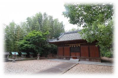 境内右側から社殿と境内社の眺め。境内は竹の多い社叢が囲んでいます。