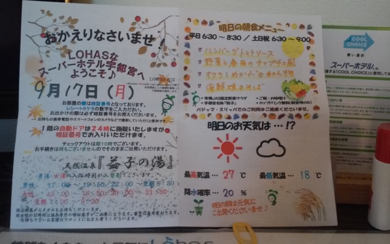 よく通る道にあって、いつかいつかと思っていましたが、やっと念願叶って宿泊しました。ホテルから電車が見えるのが楽しいです。付近にはコンビニも食べ物屋さんもないと聞いていたので、途中で調達してからチェックインしました。スタッフに聞いたところ、近くの日帰り入浴で食事だけでも出来ると。その場合はうち(sun おのがみ)で割引券を出しますよと言ってました。
