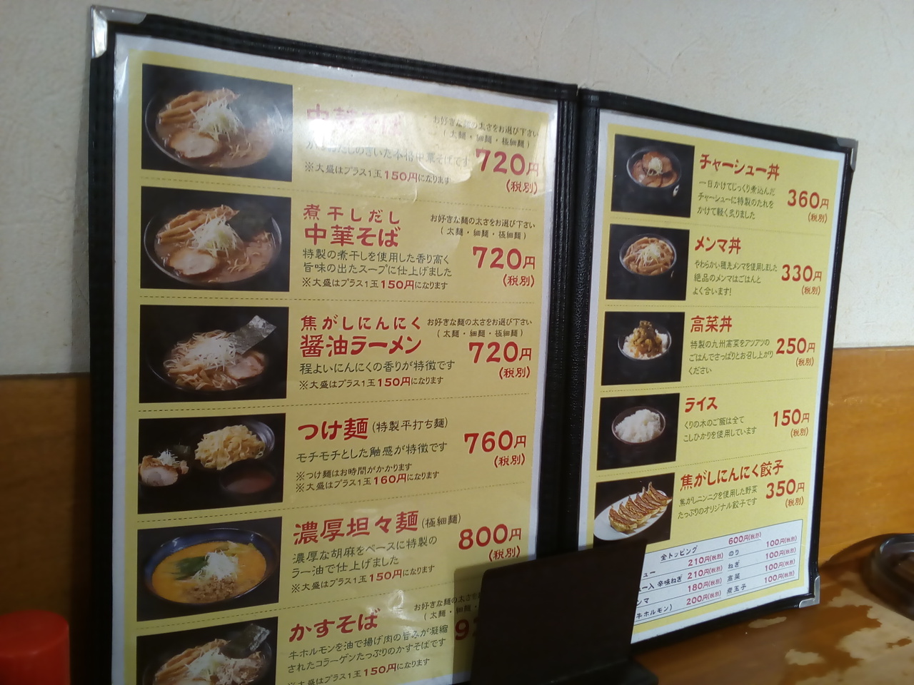 麺は3種類(太麺・細麺・極細面)から選べます。店内はカウンター、テーブル席それぞれにパネル板が設置されています。トッピングも多く、ご飯ものもあるので、ガッツリ組も麺と組み合わせて食べられます。ランチメニューもあります。