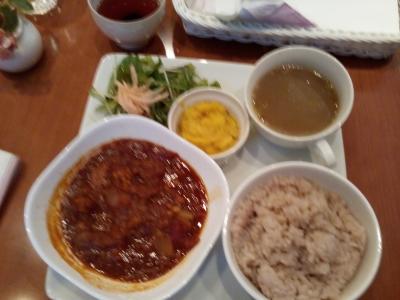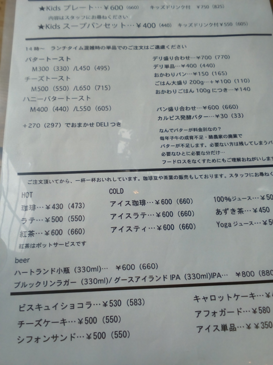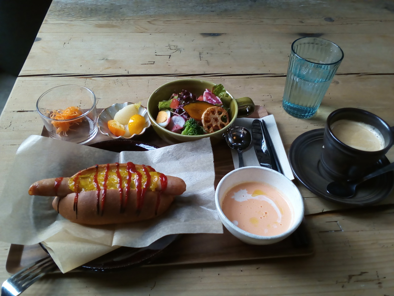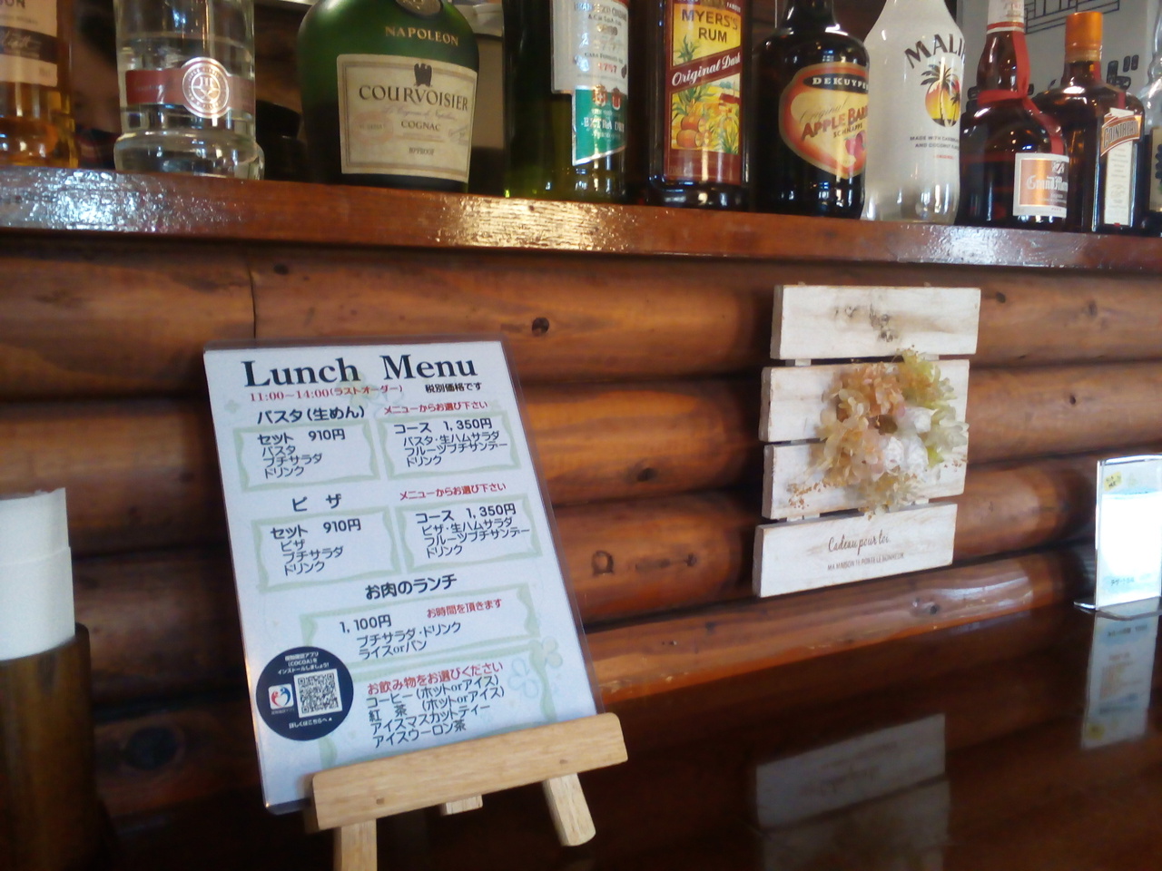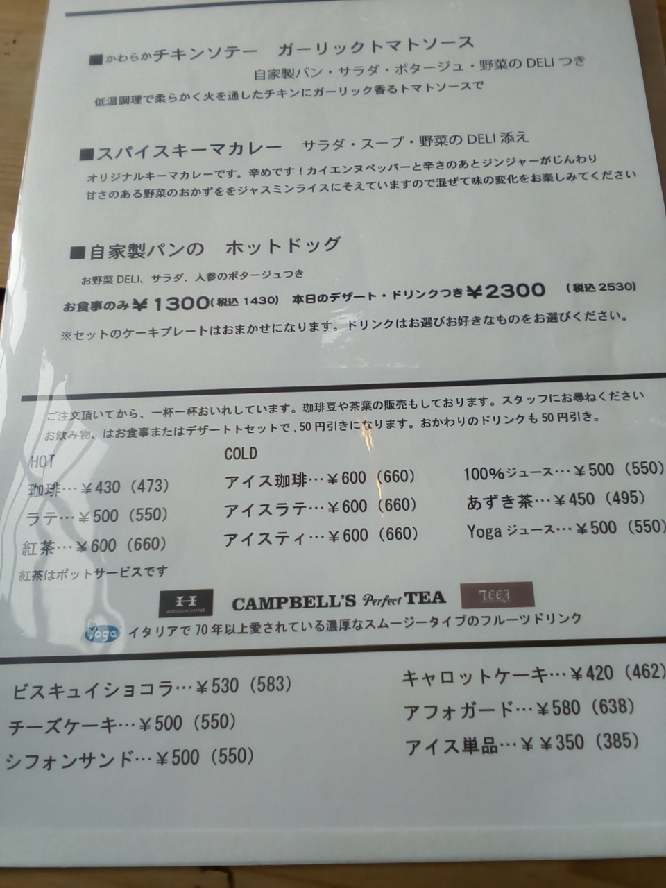 外から見ると狭そうで、しかも雑貨屋さんかな?と勘違いしそうな雰囲気ですが、店内は広くて2階席もあります。ランチはカレー2種類とホットドックの3種類、2時からはデザートなどもあります。駐車場は店の前と隣に6台分。お値段はちょっと高め。