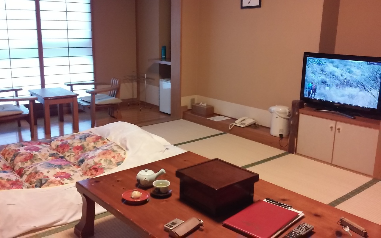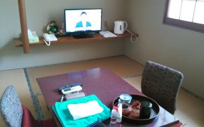 県道81号沿いですが、気をつけていないと通りすぎてしまうくらい目立たない宿です。かなり古くて、手入れもあまりできないようです。でもWifi はビジネスホテルなみに部屋でも繋がりました。この日はマラソン大会があったと言うことで、日帰り入浴のお客が何人かいました。