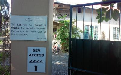 空港からタクシーで3時間、メインストリートは未舗装で足元が悪いですが、コテージやお土産やさん、ダイビングショップなどが軒を連ねます。レストランもあります。海岸沿いはバンカーボート乗り場で、ここからダイビングやシュノーケリングに出発します。
