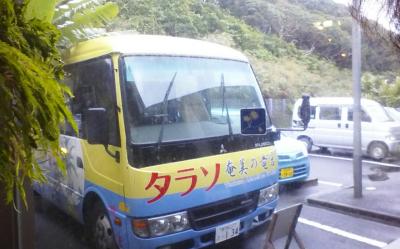 着いた日の翌日はあいにく雨だった上にまだレンタカーは借りていなかったので、しまバスとタクシーを乗り継いで行きました。送迎バスは行き3便、帰りも3便のみなので時間が合いませんでしたが帰る時だけ使いました。乗客はみんな常連の高齢の方たちで運転手さんとも顔なじみ。和気あいあいの雰囲気で楽しかったです。