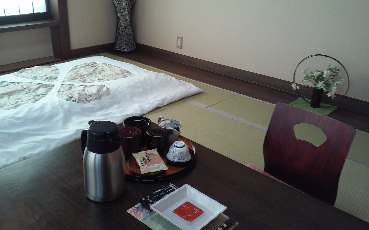 素泊まりだったので、ふわふわ豆腐鍋は食べませんでした。客室は10部屋で内1階は2部屋のみ。残りは2階で階段使用。さらにお風呂は階下(地下?)なのでまた階段です。湯船に入るときの手すりはありませんが、洗い場の椅子が2種類(ちょっと高めの4本足の付いたものも)あるので、それを湯船に入るときに代用しました。