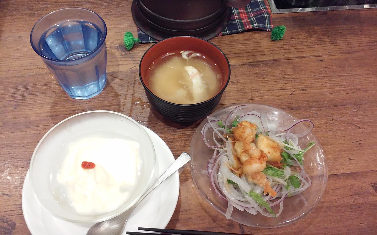 新幹線を降りた後、移動中に入りました。連れはかに玉チャーハン。私は新幹線の中でお弁当を食べてしまったので、ピリ辛サラダと自家製杏仁豆腐をいただきました。連れはともかく私は少ししか頼まないのに、味噌汁もついた。二人合わせて千円ちょっと。