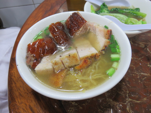 ガチョウ麺に火肉をトッピングしました。スープは比較的あっさりしています。麺も香港ほどモソモソしておらず食べやすいです。ガチョウはジューシーでとてもおいしかったです。火肉も皮目がぱりっとしていておいしいです。まったく脂っこくありません。