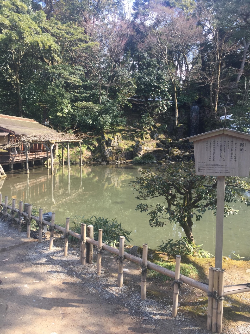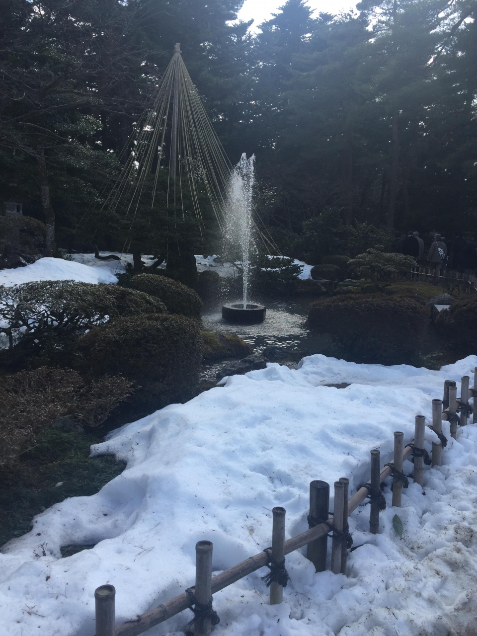 上にある霞ヶ池を水源として自然の水圧で噴出しているので、水の高さが霞ヶ池の水位によって変わる(通常は3.5m)そうです。金沢城二の丸居間先にある噴水の試作品だそうですが、雪の残る庭の中で真っすぐに上がる水がとてもきれいでした。