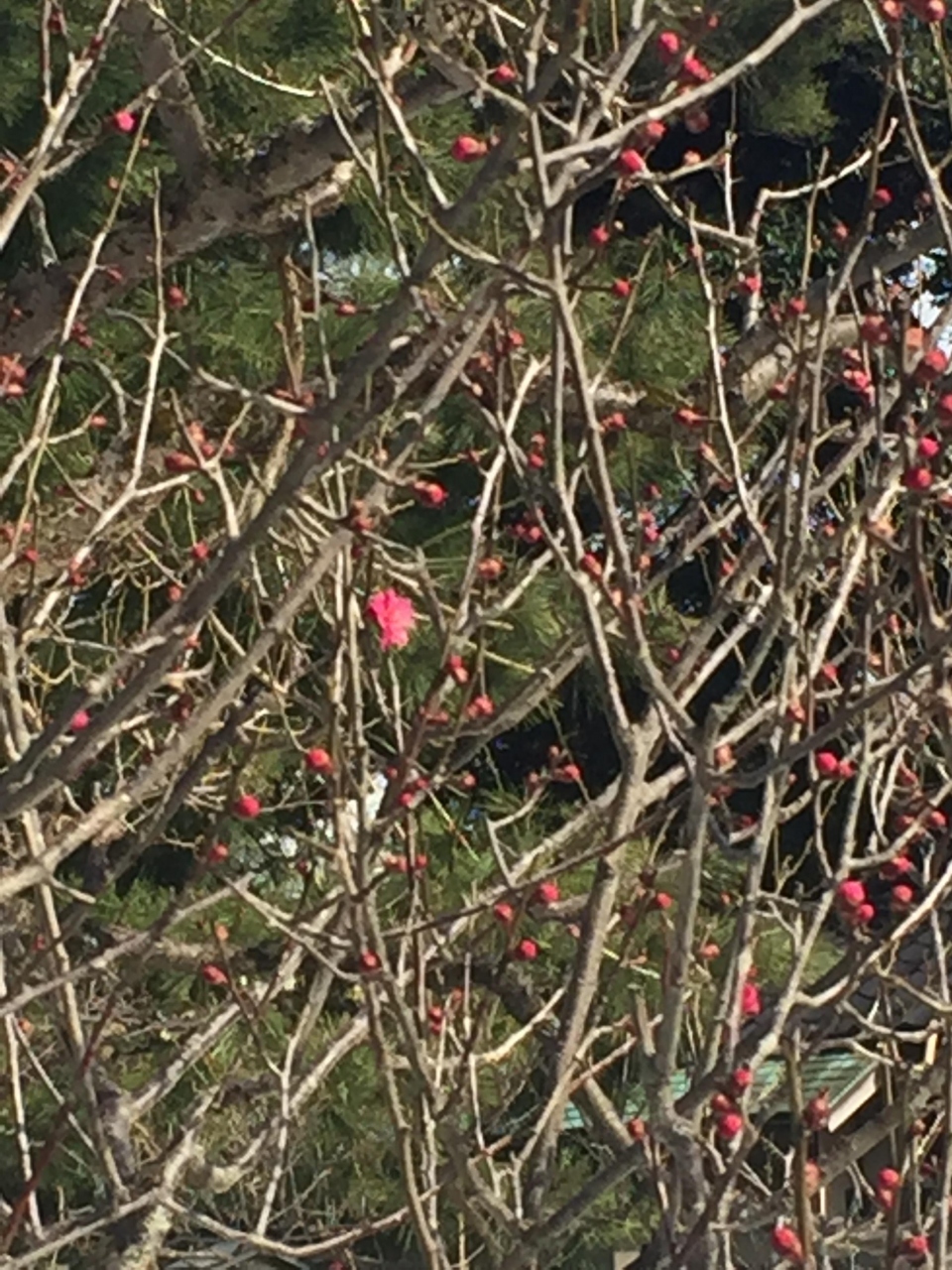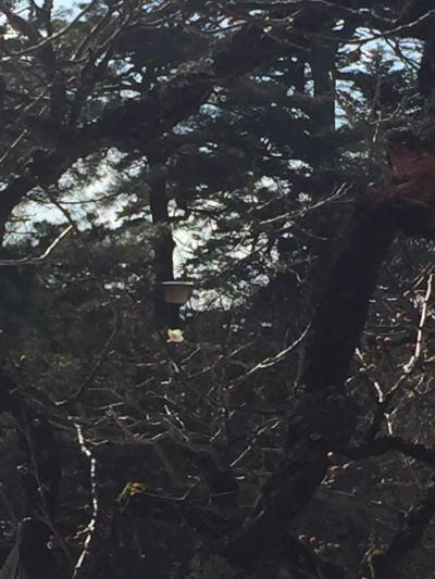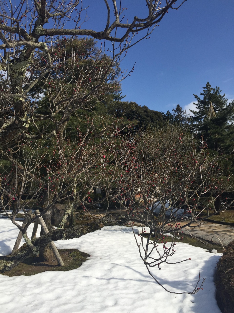 地面に残っている雪の白と晴れ渡った空の青に紅梅の蕾がとても綺麗でした。まだ時期が早かったらしく蕾がついている木も少ない中でポツンと咲いている姿に感動。満開は素晴らしいのでしょうけど、これはこれで素敵でした。