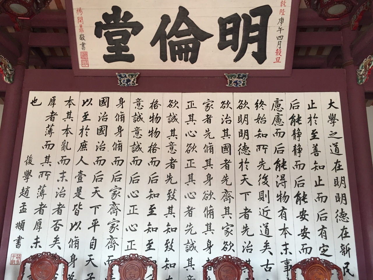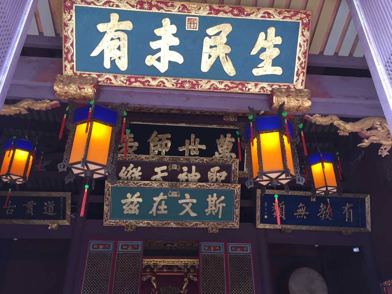 内部に入るには入場料が必要です。内部では扁額や書、古い楽器など歴史的な展示物を見ることができます。孔子廟前の公園ではカラオケ大会が繰り広げられていました。ベンチでおしゃべりするお年寄りや小さな子供たち。若いカップルなど市民の憩いの場です。