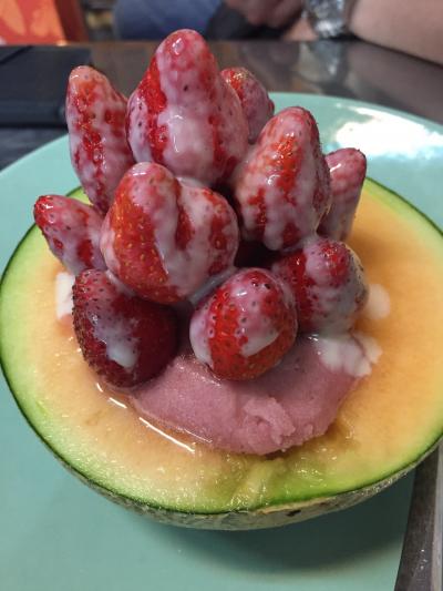 半分に切ったメロンの種部分に葡萄アイスが入ってその上に苺がタワーになって練乳がかかっている…。文章にするとまどろっこしいけど、実物はインパクト大です。アイスは選べませんでしたが、果汁感たっぷり。満足します。冬限定だそうです。