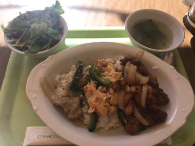 ごはんのランチ¥880を注文。オカズを10種類くらいある中から3種選べます。グリーンカレー、ゴーヤと卵の炒め物、鶏肉とカシューナッツ炒めにしました。スープ、サラダ、ジャスミン茶付き。セルフ調味料のスイートチリソースが凄く美味しかったです。