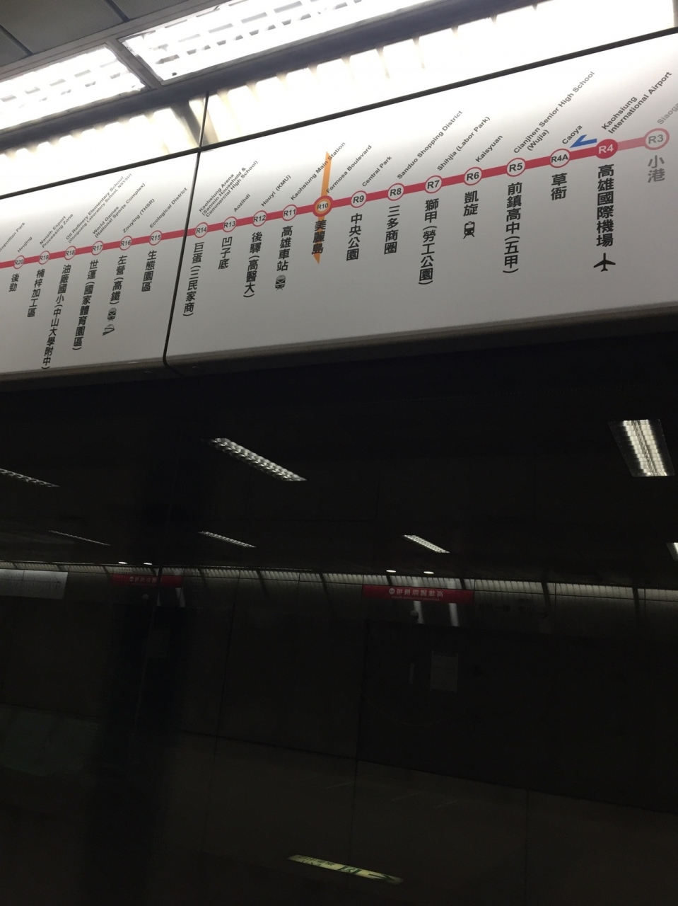 高雄国際機場から案内板の方向へ外に出ると、すぐ右手に入口があり、地下へ降りて行くと改札があります。悠遊カードのチャージができるようになっていました。日本語の表示も選べます。夜遅いと本数が少ないし、始発は6時台、終電は0時過ぎ。