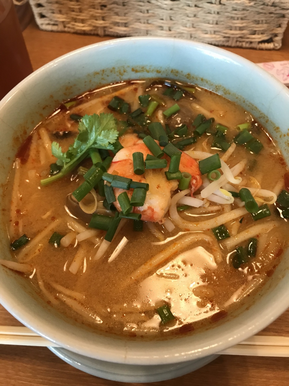 小田急線下北沢駅の2階にあるタイ料理屋さん。トムヤムクン麺がミニ生春巻き付きで1,100円。まあまあな大きさのエビが2つ、袋茸も入ってました。麺は平打ちの米粉麺。お味は濃厚だけど塩っぱくはないので◎。辛さは3段階から選べますが、大辛だと味がわからなくなりそう。美味しかったです。