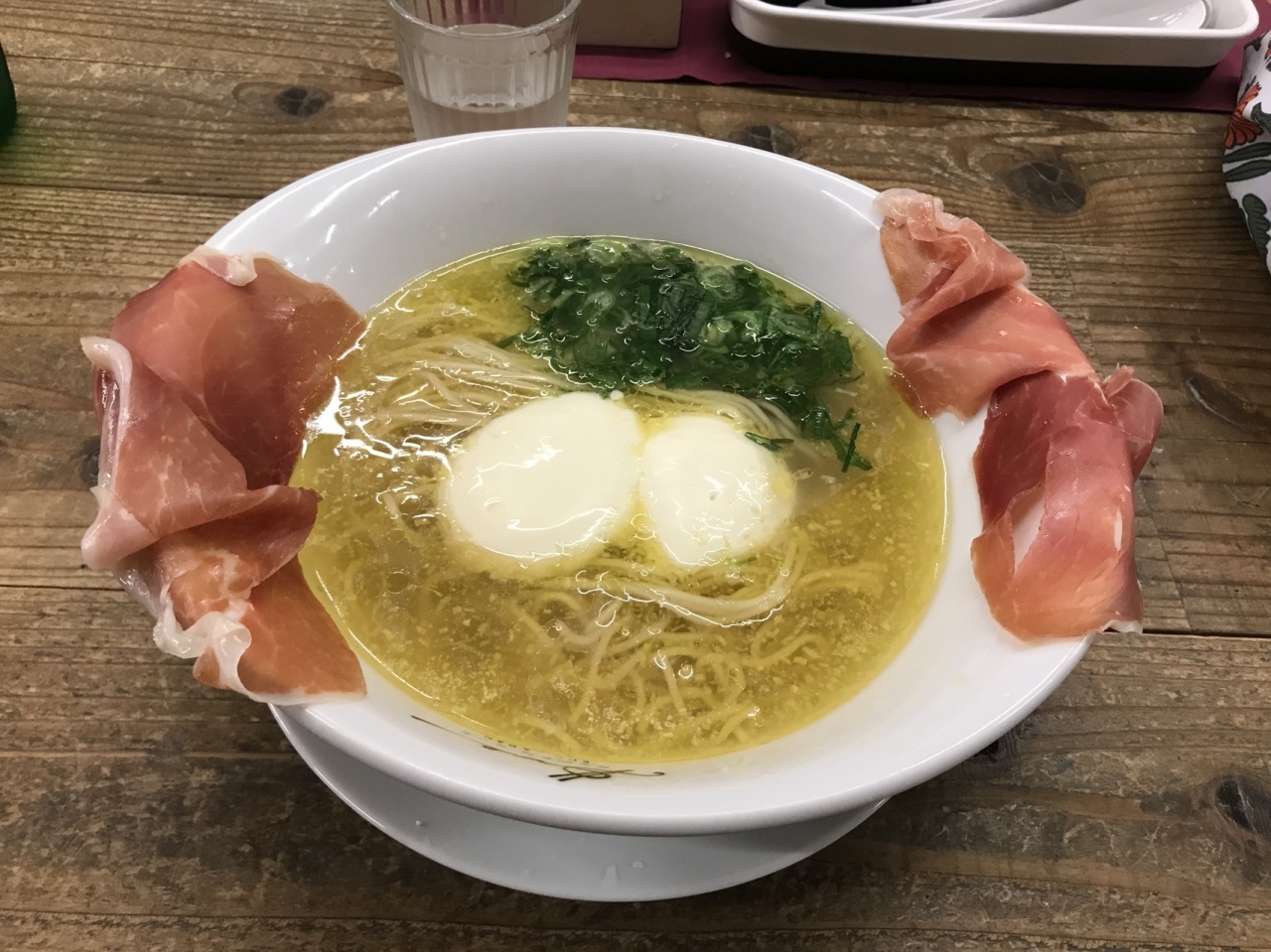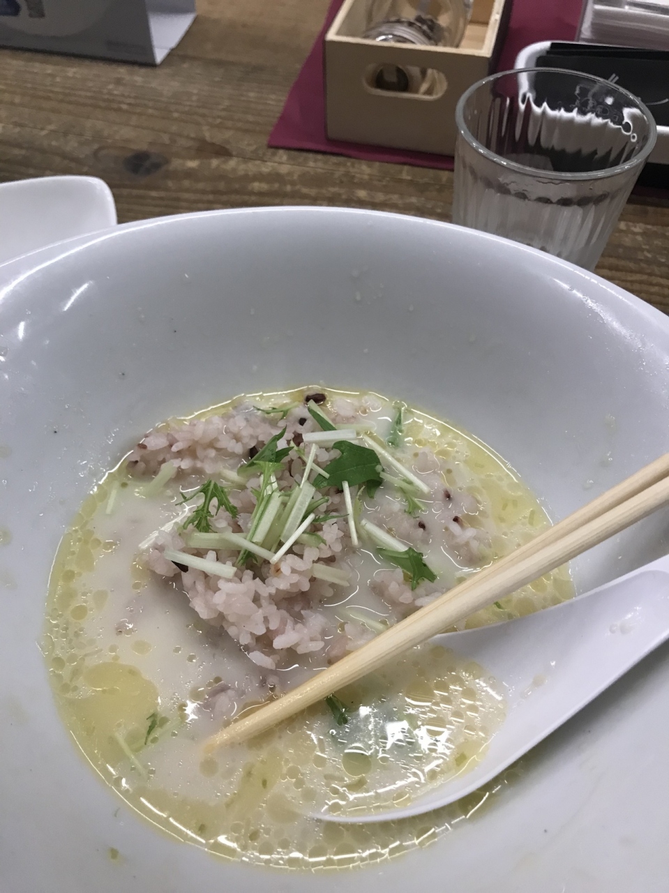 透き通った濃厚なスープと細麺に青葱とフロマージュブランが鎮座し、丼の淵に生ハムが4キレも!勇気を出して「チーズに箸を突き刺し、そこから麺を持ち上げて食べるべし」と常連さんに教わりました。青葱が良い仕事をしています。生ハムは味変のカウンターパンチャー、最後まで食べ切らないで。麺を食べ終わったら、玄米入りごはんを入れてスープまで完食しました。