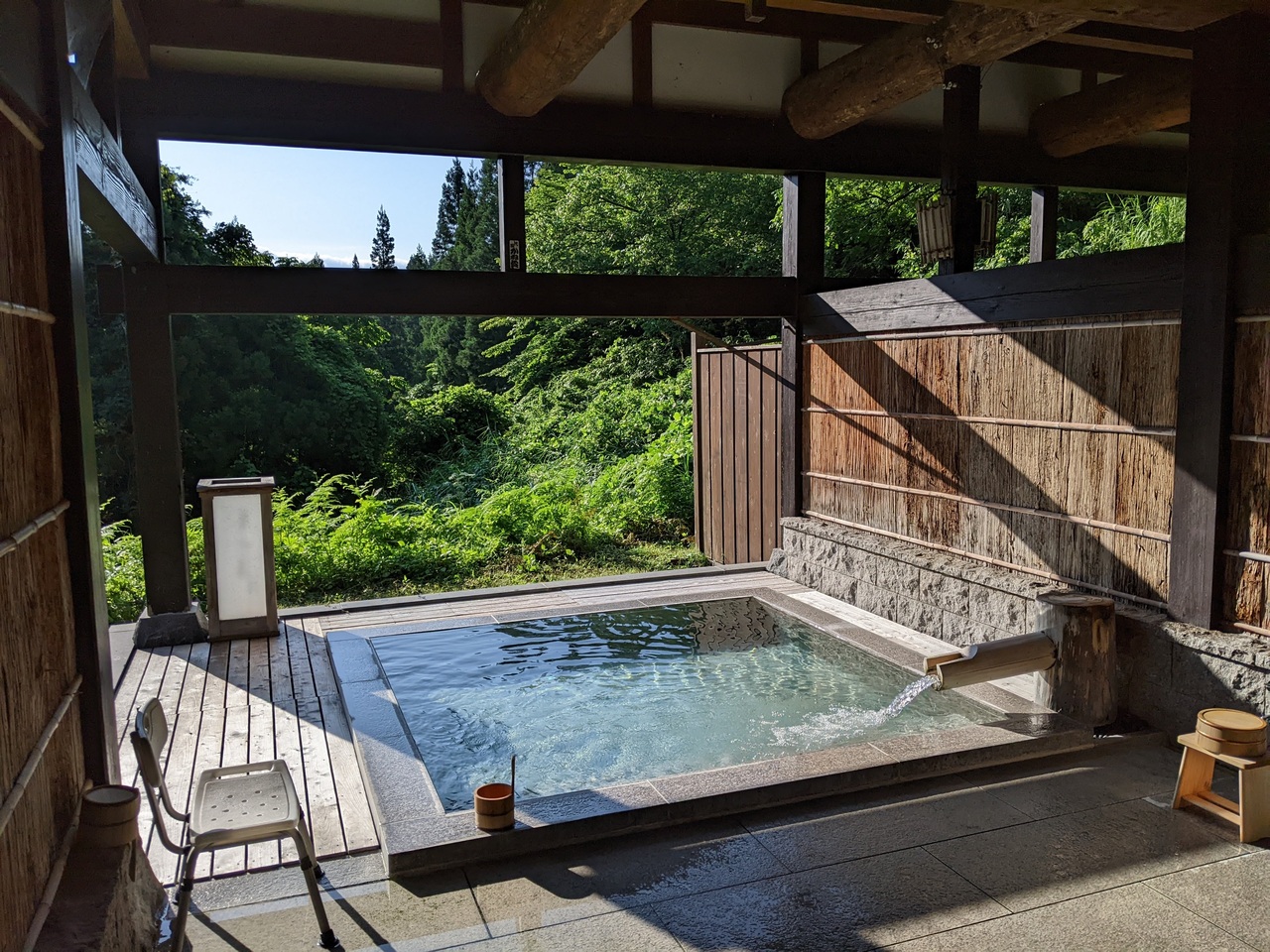 谷から吹き付ける風が心地よく、新緑の香りと鳥のさえずりに癒やされるお風呂でした。