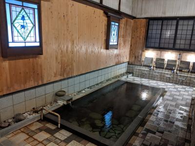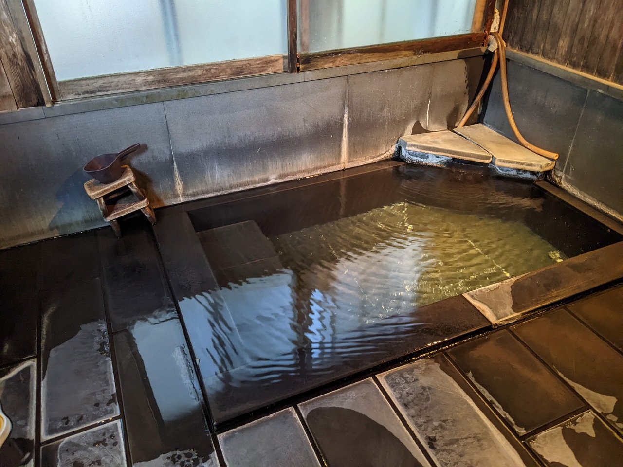 お風呂はシャワーまで源泉かけ流しで、タイル貼の内湯はレトロな雰囲。