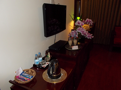 テレビ・エアコン・冷蔵庫・ヘアードライヤー・電気ポッド・烏龍茶のティーバッグ・スリッパ・石鹸・シャンプー・櫛・歯ブラシセット・使い捨てカミソリ 以上常備されていました。 パソコンでHISの海外ホテルのみ予約可能です。ツイン一部屋5400円でした(06年3月11日)。 料金は、事前にHISへ振り込みし、折り返し送ってくるバウチャーを持っていけばOKです。