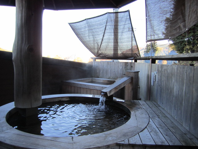四角の方はやや熱めで1人用という感じで、まわりは壁に囲まれていますので、風景は楽しめませんが、風呂が2つあるといったり来たりできて楽しかったです。すぐそばには道路もあり、壁で見えませんが、だめな方もいるかも。