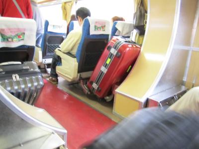 列車内はそれなりに広さはありましたが、たためないフットレストがあってスーツケースは足元に置けない。悩んでいるとガイドさん(女性)が同行者のやや小さめのキャリーは網棚へ乗っけてくれて、私のキャリーは丁度、席前に中央部の仕切りみたいな空間があったので、そこへ突っ込んでくれました。