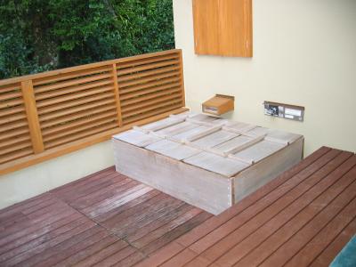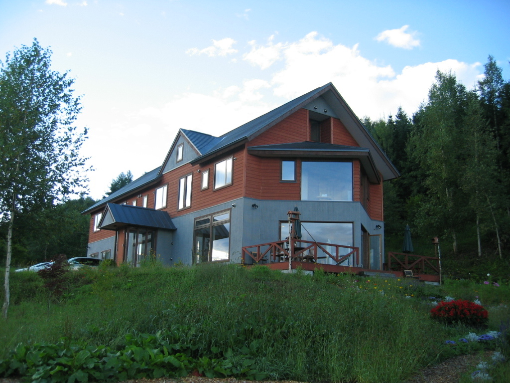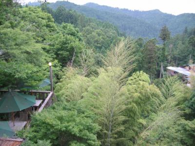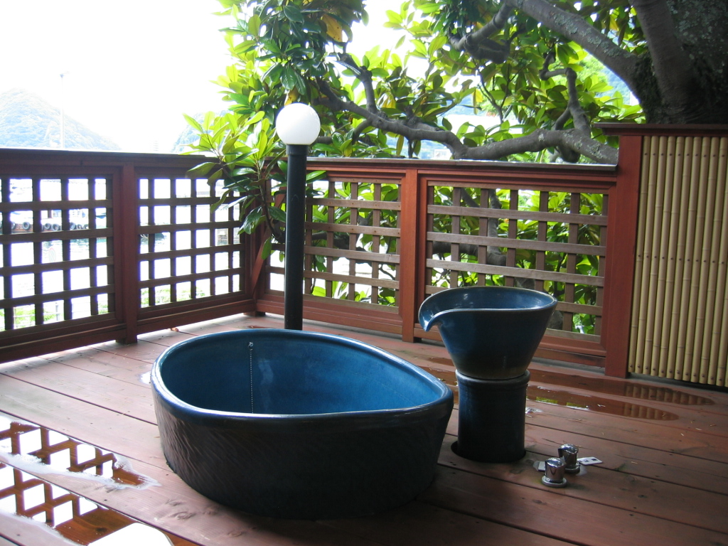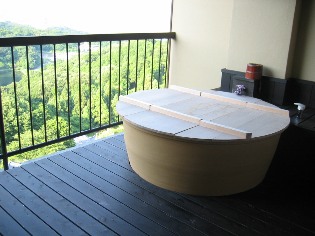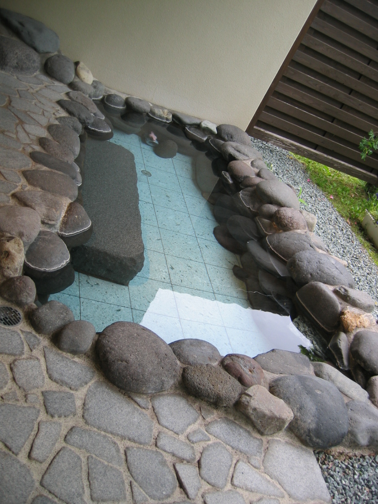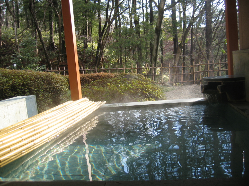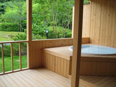 ここは温泉じゃありませんが、部屋の露天はジャグジー風呂と中の照明が青や赤や色々に変って、すごくきれいで、前面の庭も広いし遠くの山もきれい。部屋はツインベッドの他に和室もあり広いく、4人泊まるのにいいですね。