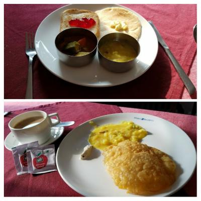 朝食はフルーツジュース、カレーが2種、トーストサークルドーサ、プーリー...