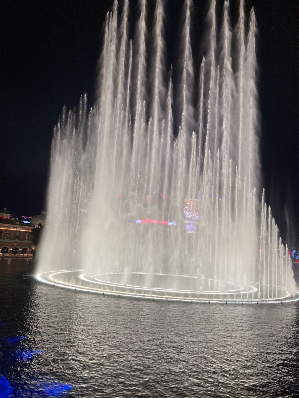 ベラージオの噴水ショーを見て来ました。ルルブや地球の歩き方にもオススメのショート紹介されています。もちろん無料で見れる噴水ショーです。お昼もしていますが、夜の方が時間が短く長く見れます。人混みは結構ありますが、何度も見せてくれるのでどんどん良い場所を取れます。噴水ショーはもう素晴らしくてまるで仕掛け花火を見ているような感じになります。音響効果も最高で噴水が何メートルも高く上がったときに仕掛け花火のようにドーンと音が鳴って迫力満点です。絶対に見に行ってください。