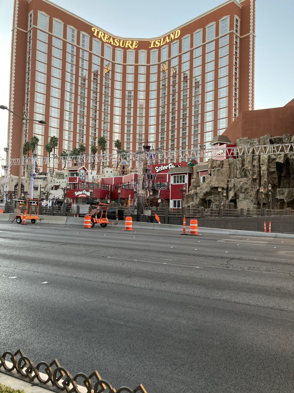 ミラージュのホテルの前のラグーンでボルケーノショーが無料で観劇できます。ストリップの中心地に立っています。ラスベガス大通りを走るデュースのバス停はホテルの直ぐ前にあります。私も楽しみにして行きましたが、この日は中止でロープが張ってありました。
