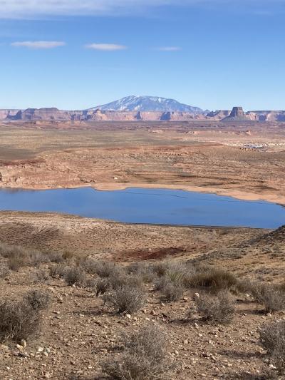 ミード湖はアリゾナ州とネバダ州を挟んであります。ミード湖の大きさはコロナコロラド川をせき止めて作られているので、上流に向かって180キロもあります。大きさは日本の琵琶湖よりも大きいようです。私たちは観光バスで立ち寄りましたが、大きすぎて写真では1部しか映りませんが雄大な湖の景色を見てください。