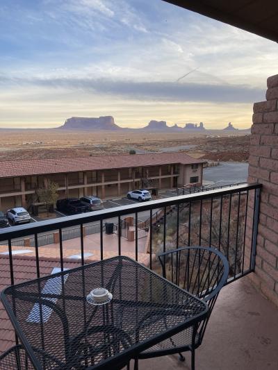 阪急交通社の旅行ツアーで訪れました。モニュメントバレーの入り口に立っています。朝日が昇るのを見るのがとても楽しみにしていましたが、確かに見ごたえのある景色です。まるで西部劇の世界に入ったような気持ちになってしまいます。ロッジ内にはレストランもあってなかなかおいしいお食事ができました。Wi-Fiも通っていて意外とサクサクと入りました。